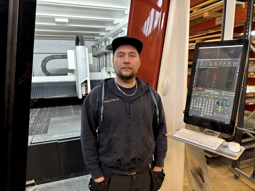 Suomen Pellin Leevi Eteläniemi ja yrityksen laserleikkaustyökalu.
